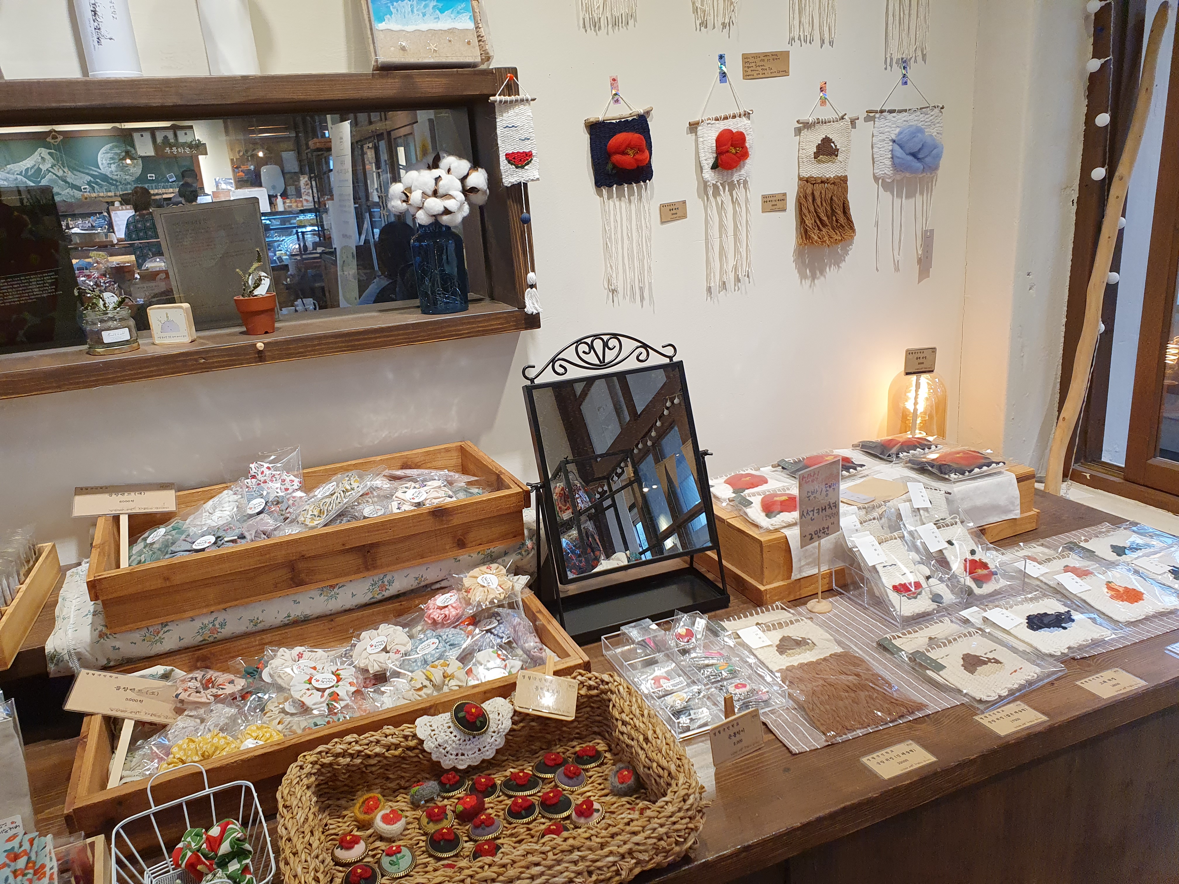 팔찌, 헤어밴드, 동백꽃 무늬의 제주도 소품들